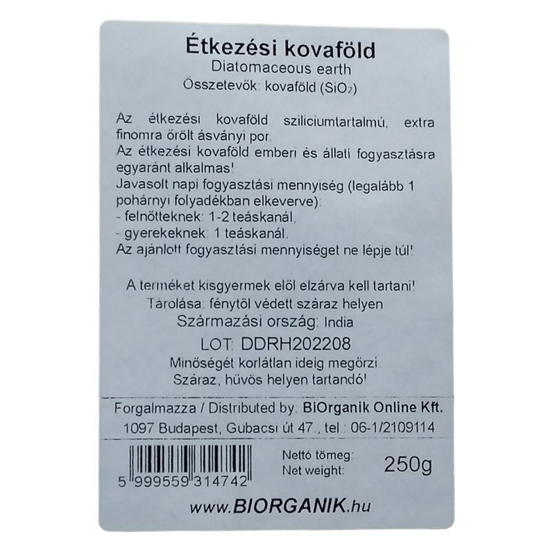 Összetevők: kovaföld. A Biorganik Étkezési kovaföld magas szilíciumtartalmú, extra finomra őrölt ásványi por. A Biorganik Étkezési kovaföld emberi és állati fogyasztásra egyaránt alkalmas! Javasolt napi fogyasztási mennyiség (legalább 1 pohárnyi folyadékban elkeverve): felnőtteknek: 1-2 evőkanál, gyerekeknek: 1 evőkanál. Az ajánlott fogyasztási mennyiséget ne lépje túl! Az étrend-kiegészítő nem helyettesíti a kiegyensúlyozott vegyes étrendet és az egészséges életmódot!