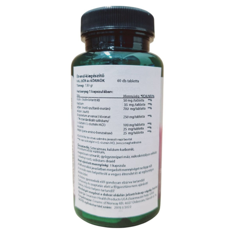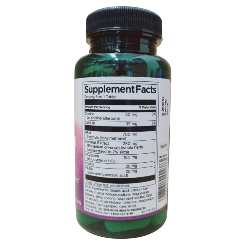 A Swanson Health Products HAJ, BŐR és KÖRMÖK étrend-kiegészítő tablettái különleges összetevőket tartalmaznak, amelyek hozzájárulhatnak a haj, bőr és körmök egészségének támogatásához. A termékben található MSM, kolin, mezei zsurló kivonat és más hatóanyagok segíthetnek a szervezet megfelelő működésének fenntartásában. A termék napi ajánlott mennyisége 1 kapszula, amelyet nem szabad túllépni. A termék nem helyettesíti a vegyes étrendet és az egészséges életmódot, és terhesség, valamint szoptatás alatt nem ajánlott a fogyasztása. A tabletták összetevői között szerepelnek a sztearinsav, kálcium-karbonát és a mikrokristályos cellulóz is. A terméket száraz, hűvös helyen kell tárolni, és gyermekek elől elzárva tartandó.
