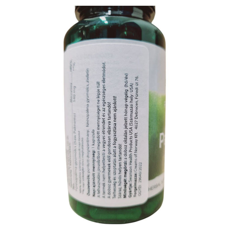 A Swanson Fűrészpálma gyümölcs kapszula egy étrend-kiegészítő, amely 540 mg fűrészpálma gyümölcsöt tartalmaz kapszulánként. A terméket az USA-ban gyártják, és a Creams of Norway Kft. forgalmazza Magyarországon. A fűrészpálma gyümölcs hozzájárulhat a férfiak egészségének támogatásához. A termék vegan kapszulát tartalmaz, és nem helyettesíti a vegyes étrendet. Fontos, hogy a javasolt napi adagot ne lépje túl, és terhesség, szoptatás alatt ne fogyassza. Tárolja száraz, hűvös helyen, gyermekektől elzárva.
