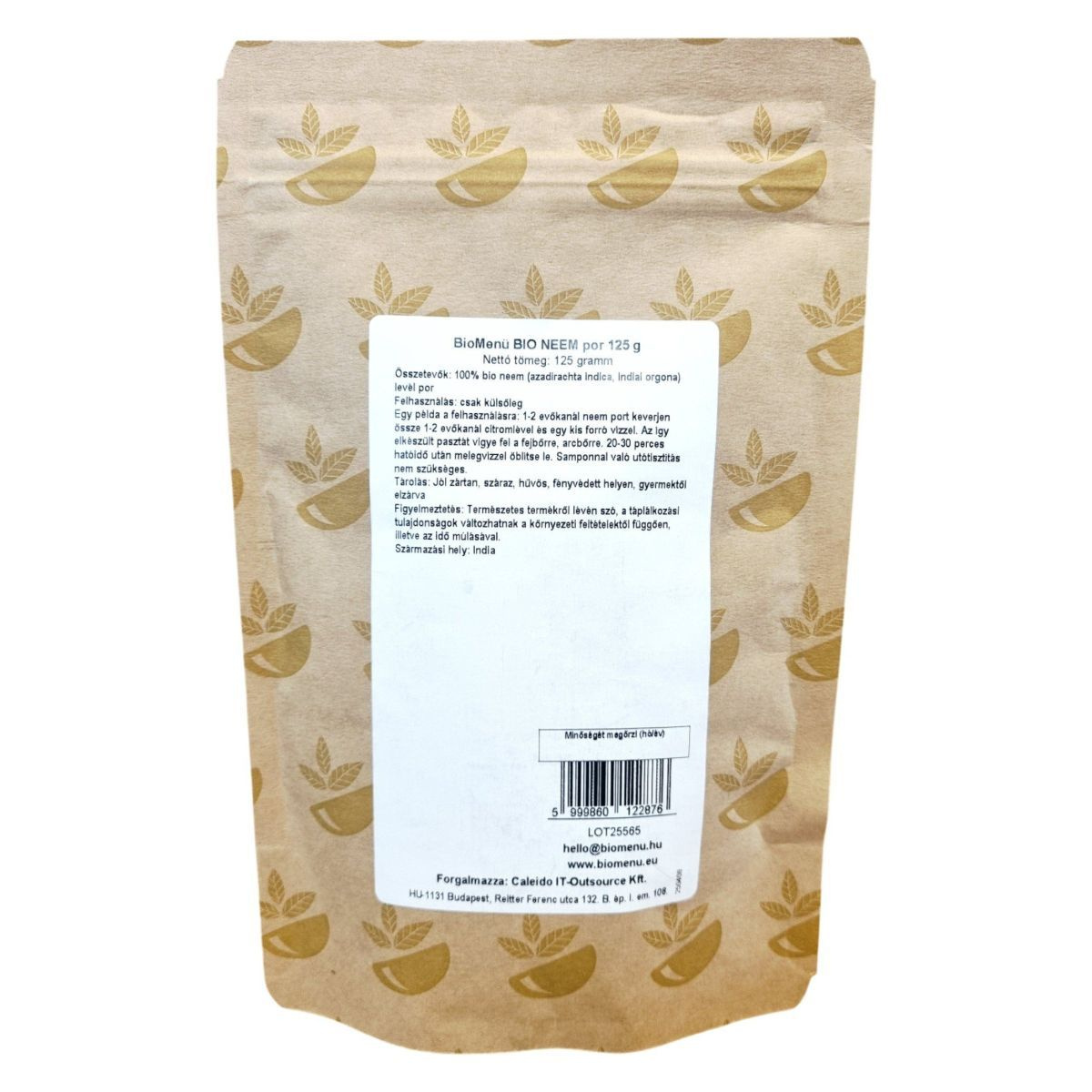 A BioMenü BIO NEEM por 125 g egy 100% tiszta, organikus és nyers neem levél por, amelyet külsőleg alkalmazhatunk. A termék vegán és bio minősítésű, Indiából származik.