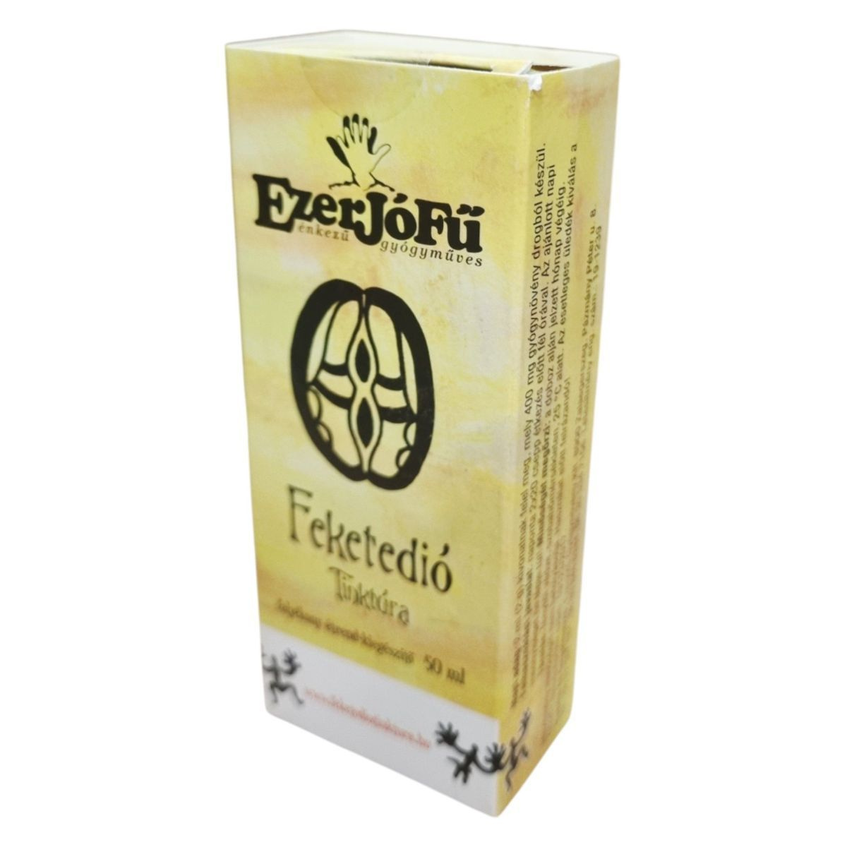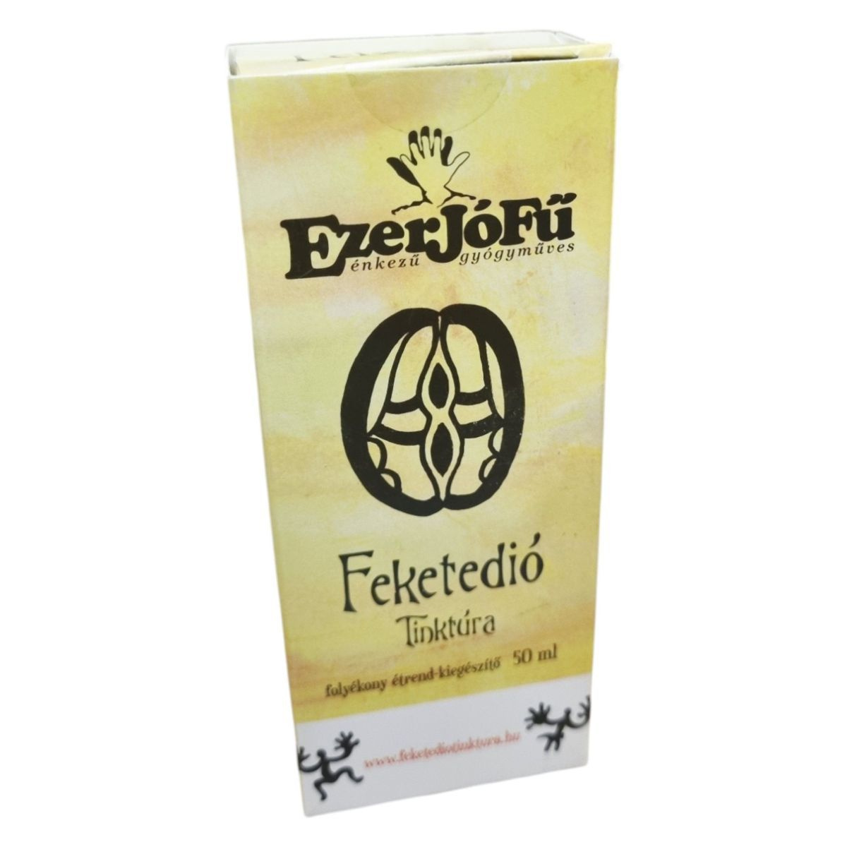 Az EzerJóFű Feketedió Tinktúra egy természetes alapanyagokból készült étrend-kiegészítő, amely a feketedió terméshéjának kivonatát tartalmazza. Az EzerJóFű Gyógynövény Kft. termékei a természetes egyensúly fenntartására törekednek, és a Göcsej régió tiszta környezetéből származó bio alapanyagokból készülnek. A tinktúra alkoholtartalma 36 V/V %, ezért alkalmazása nem javasolt alkoholbetegeknek, terhes és szoptató nőknek, valamint gyermekeknek. A termék fogyasztása nem helyettesíti a kiegyensúlyozott vegyes étrendet és az egészséges életmódot.