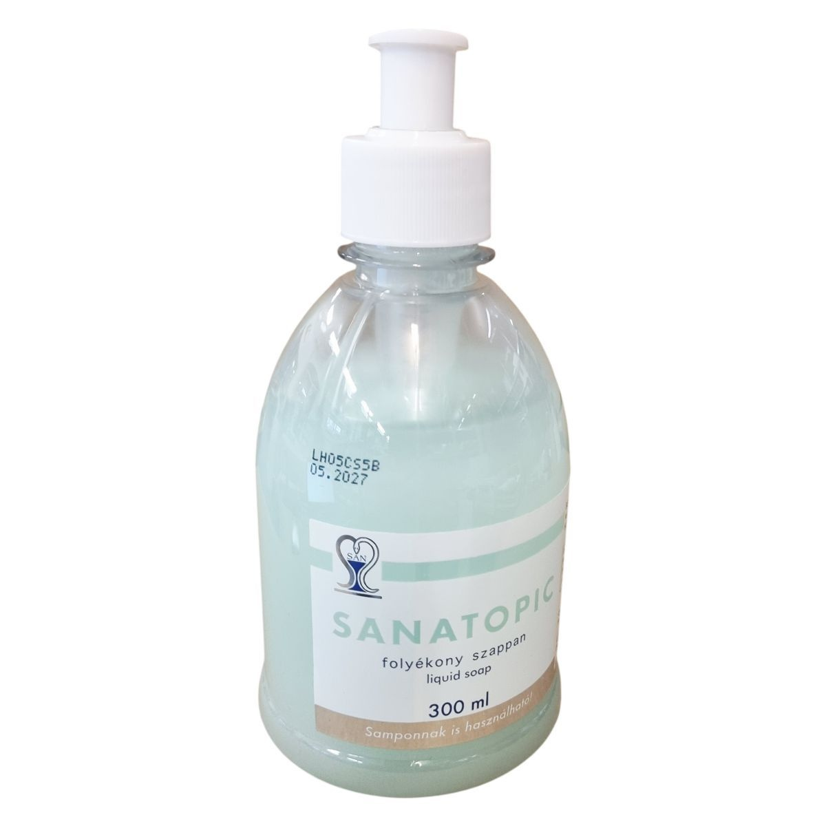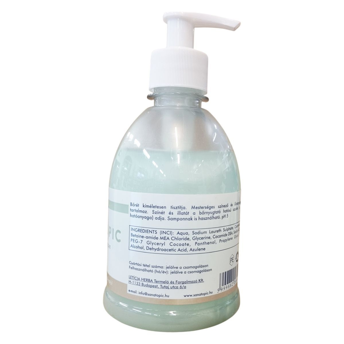A Sanatopic folyékony szappan kíméletes bőrtisztítóhatással rendelkezik, pH-értéke 5, így használata nem irritálja a bőrt. Termékünk nem tartalmaz mesterséges színező- és illatanyagokat, színét és illatát az azulénnek köszönheti, amely a kamilla egyik hatóanyaga, bőrnyugtató hatású. A termék samponként is kiválóan alkalmazható, többfunkciós, praktikus kozmetikumként szolgál. A csomagoláson megtalálható a gyártási tételszám és a felhasználhatósági idő is. A készítményt állatkísérletekkel nem tesztelték, környezetbarát csomagolásban kerül forgalomba.
