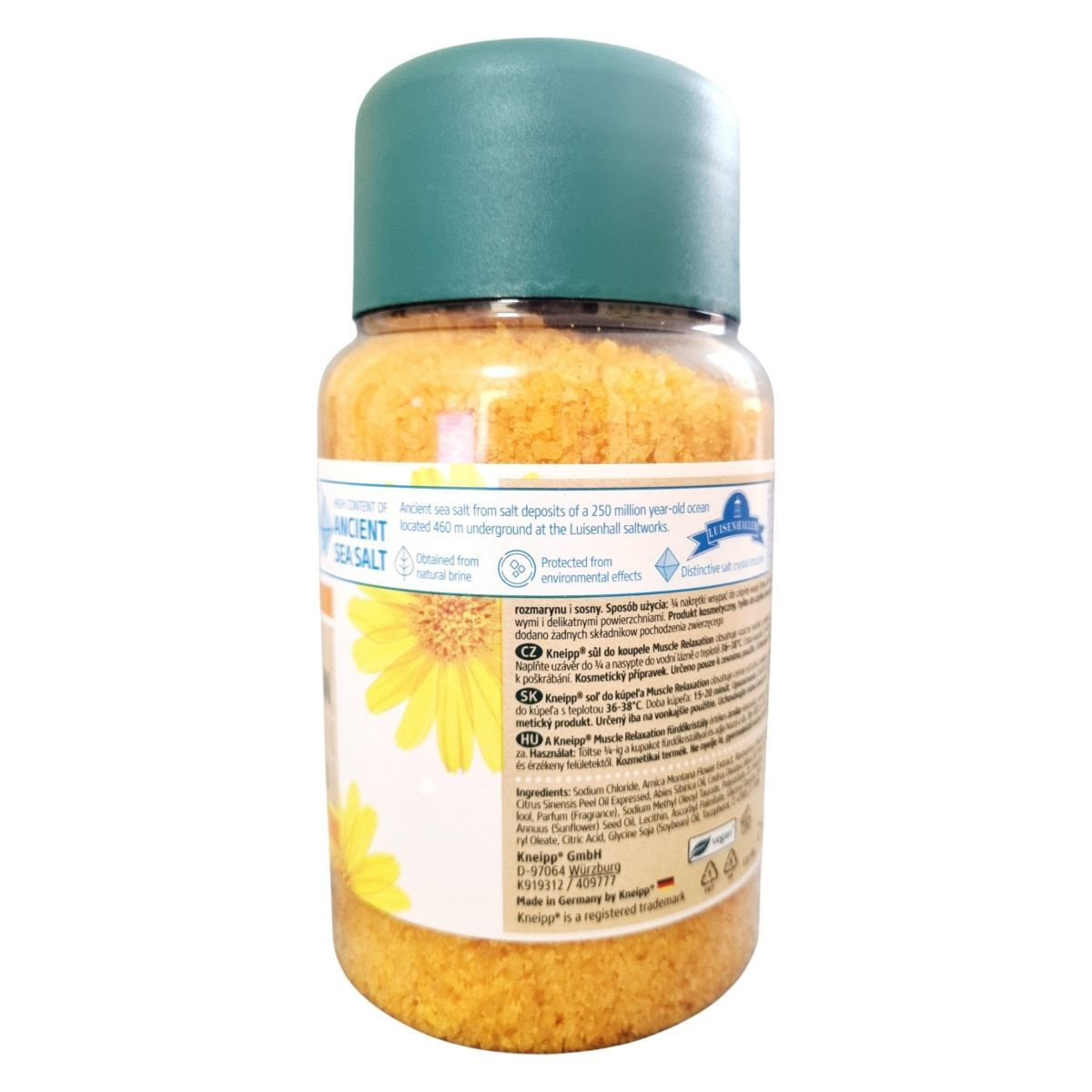 A Kneipp Mineral Bath Salt Muscle Relaxation fürdősó különleges összetevői, mint az árnika-kivonat és a természetes illóolajok, segítenek az izmok ellazításában és a feszültség oldásában. A termék 250 millió éves óceán sólerakódásaiból származó tengeri sót tartalmaz, amelyet a Luisenhall sólepárlóban nyernek ki. A fürdősó használata egyszerű: a kupakot 3/4-ig töltse meg a sóval, és adja hozzá a meleg fürdővízhez, majd élvezze a 15–20 perces pihentető fürdőt. A termék vegán, és nem tartalmaz állati eredetű összetevőket, így ideális választás azok számára, akik természetes és etikus kozmetikumokat keresnek.