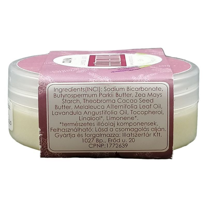 ÖSSZETÉTEL (INCI): Sodium Bicarbonate (szódabikarbóna), Butyrospermum Parkii Butter (shea vaj), Zea Mays Starch (kukoricakeményítő), Theobroma Cacao Seed Butter (kakaóvaj), Melaleuca Alternifolia Leaf Oil (ausztrál teafaolaj), Lavandula Angustifolia Oil (orvosi levendulaolaj), Tocopherol (E-vitamin), Linalool* Limonene*. *természetes illóolaj komponensek.