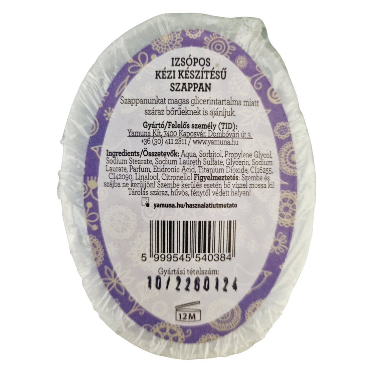 A Yamuna izsópos kézi készítésű szappan magas glicerintartalma miatt kifejezetten száraz bőrre is ajánlható, kíméletes tisztítást biztosíthat.