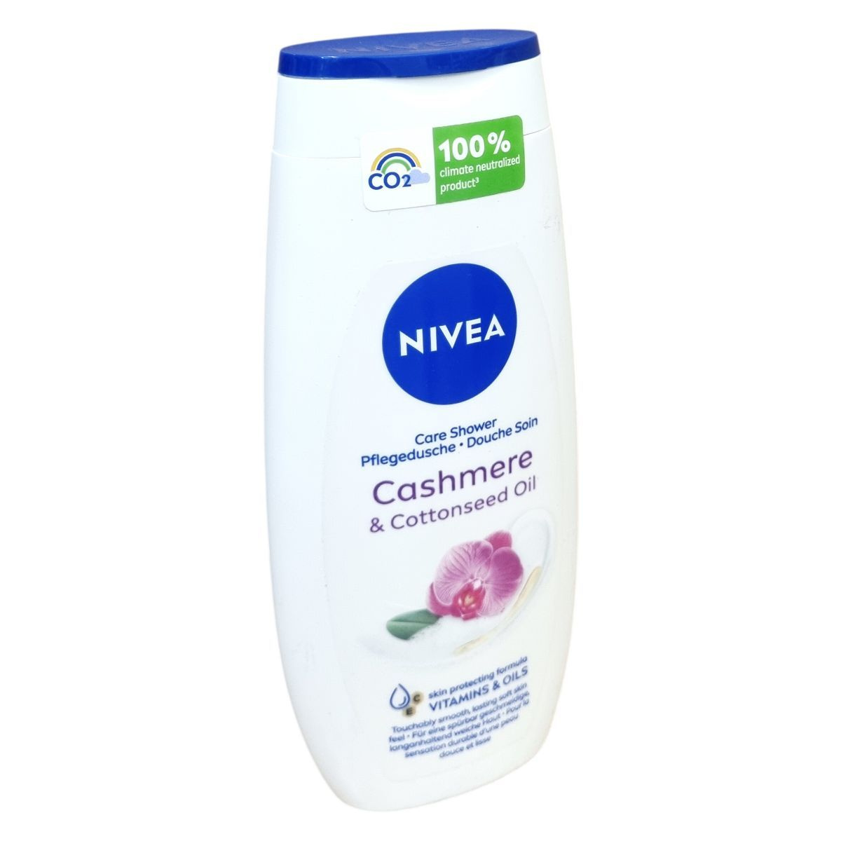 A NIVEA Care Shower Cashmere & Cottonseed Oil tusfürdő bőrbarát formula C- és E-vitaminokkal, valamint értékes olajokkal, melyek megakadályozzák a bőr kiszáradását és támogatják a bőr természetes mikrobiomját. A termék CO2-kibocsátása kompenzált, így klimatikusan semleges. A csomagolás környezetbarát, 97%-ban újrahasznosított műanyagból készült, kivéve a kupakot és az etikettet. A termék hosszan tartó puhaságot és simaságot biztosít a bőrnek, miközben kíméletesen tisztít.