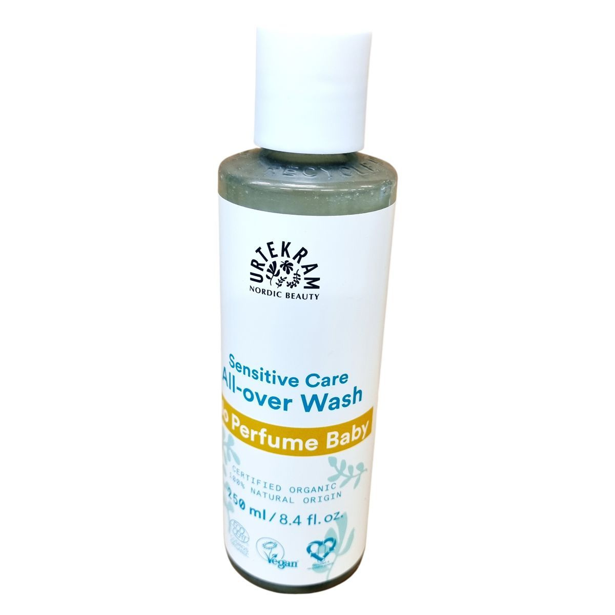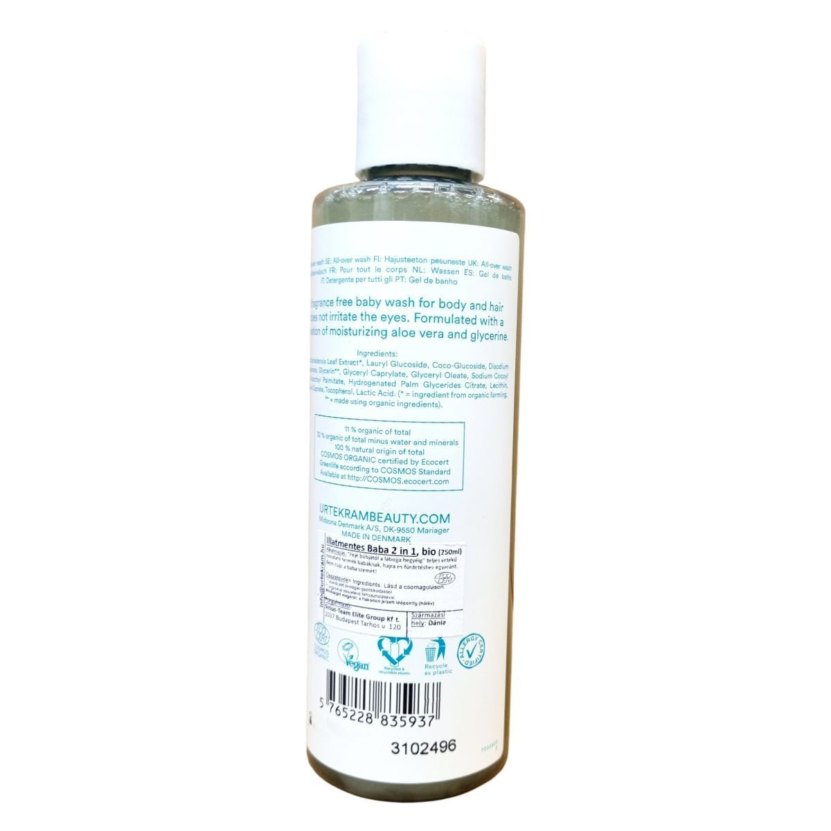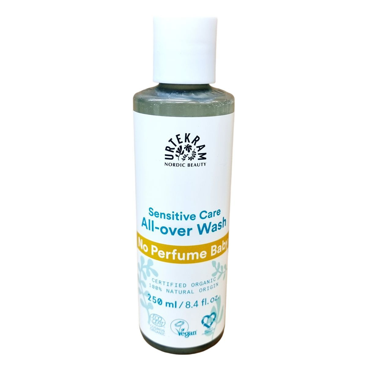 Az Urtekram Sensitive Care All-over Wash egy 100%-ban természetes eredetű, COSMOS Organic minősítéssel rendelkező babaápolási termék, amely bio összetevőket használ. Hidratáló aloe vera és glicerin kombinációja gondoskodik a baba bőrének gyengéd ápolásáról hajmosás és testfürdetés során. Illatanyagmentes, szemkímélő formula, amely nem vált ki allergiás reakciókat és a baba érzékeny bőréhez igazodik. A termék újrahasznosítható, és környezetbarát csomagolásban kerül forgalomba. Származási helye Dánia.