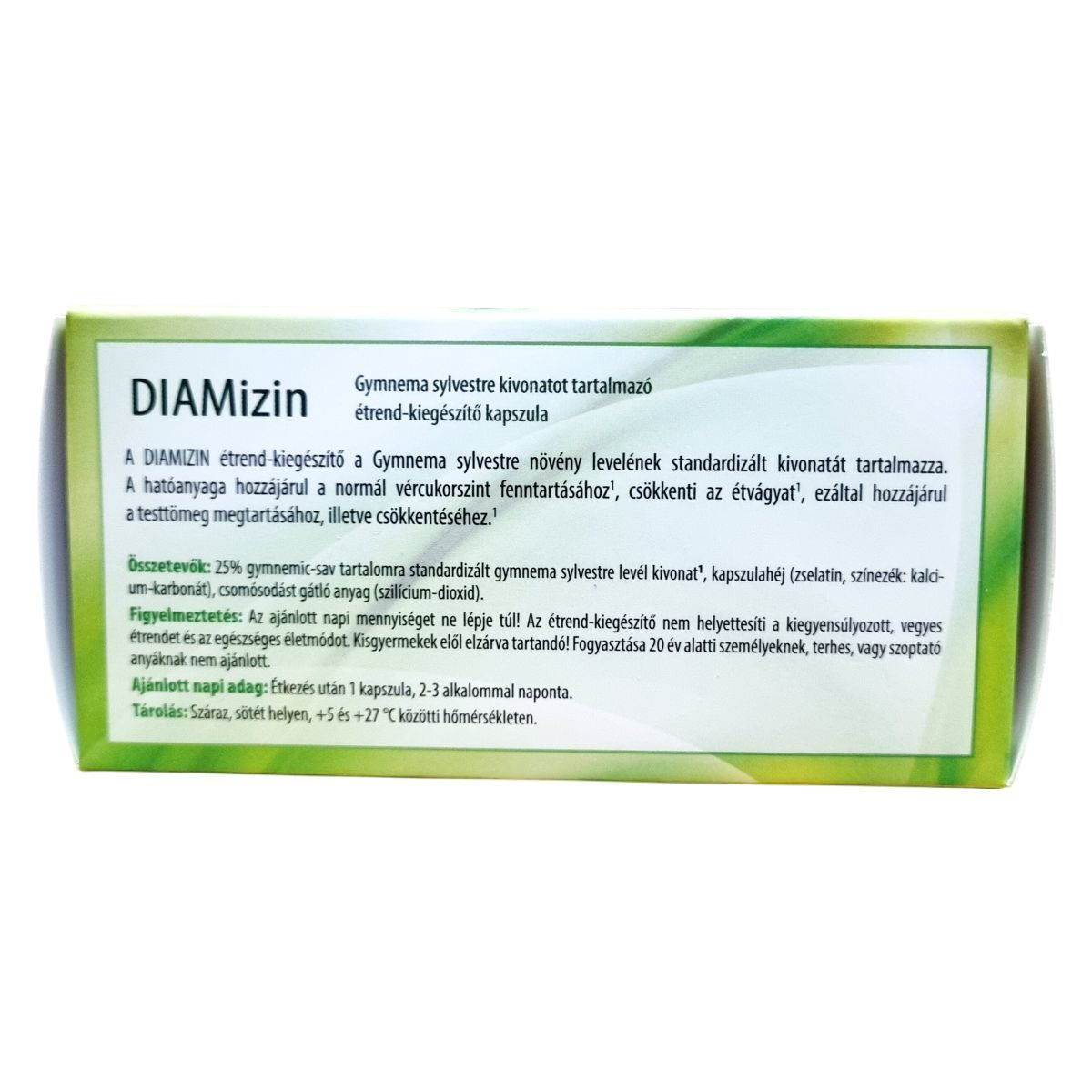 A DIAMizin étrend-kiegészítő kapszula a Gymnema sylvestre növény levelének standardizált kivonatát tartalmazza, amely hozzájárulhat a normál vércukorszint fenntartásához és csökkentheti az étvágyat. A termék 50 kapszulát tartalmaz, és mesterséges színezékek nélküli kapszulákból áll. Az ajánlott napi adag étkezés után 1 kapszula, 2-3 alkalommal naponta. A termék nem helyettesíti a kiegyensúlyozott étrendet és az egészséges életmódot, és nem ajánlott 20 év alatti személyeknek, terhes vagy szoptató anyáknak. Tárolása száraz, sötét helyen, +5 és +27 °C közötti hőmérsékleten javasolt. A kapszulák színeltérései a termék természetességéből adódnak, és nem jelentenek minőségi problémát.