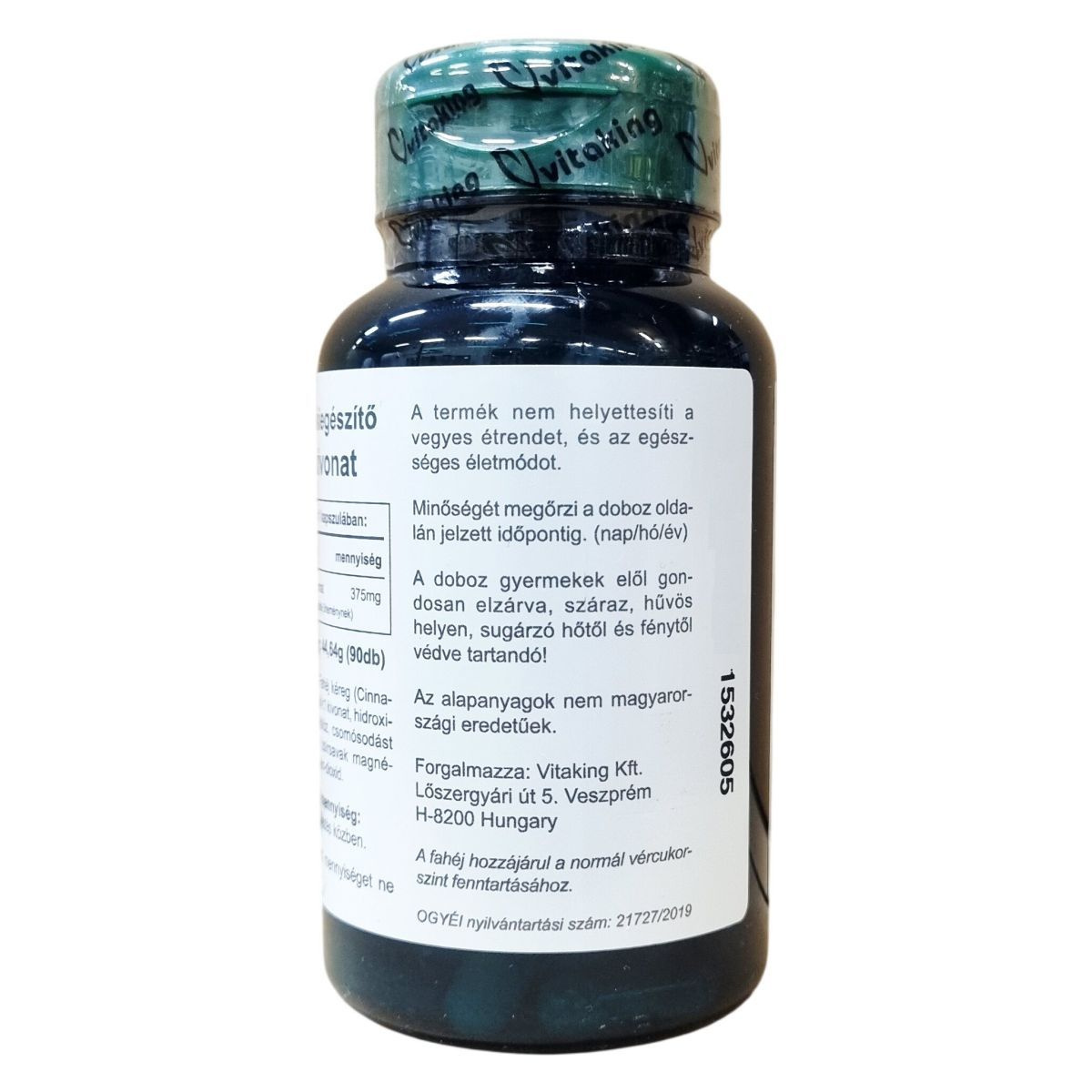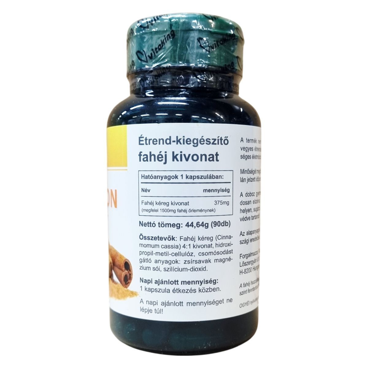 A Vitaking Cinnamon kapszula fahéj kéreg kivonatot tartalmaz, melynek mennyisége kapszulánként 375 mg, ez 1500 mg fahéj őrleménynek felel meg. A kapszula hidroxipropil-metil-cellulóz alapú, csomósodást gátló anyagokat, például zsírsavak magnézium sóit és szilícium-dioxidot tartalmaz. A termék nem helyettesíti a változatos étrendet és az egészséges életmódot. Az alapanyagok nem magyarországi eredetűek. A termék 90 kapszulát tartalmaz, nettó tömege 44,64 gramm.