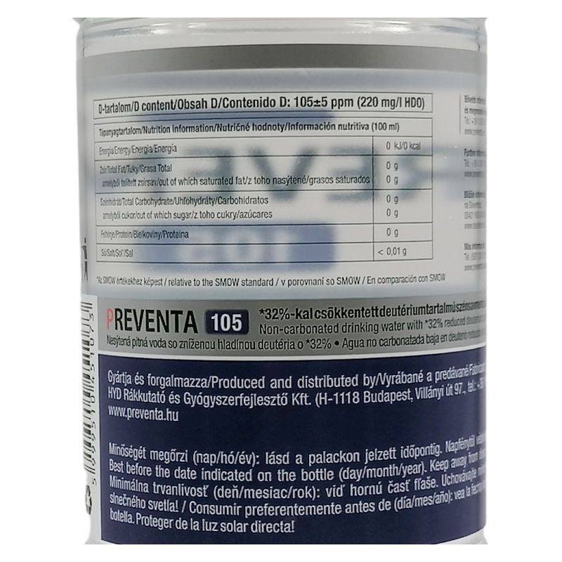 105 ppm D-tartalom (220 mg/l HDO), 1,5 liter. Szén-dioxid: 4g/L. A csökkentett deutérium tartalmú élelmiszer-készítményeket az illetékes hatóságok még nem ismerték el gyógyszerként, így ezeknek a hatályos jogszabályok szerint gyógyhatás nem tulajdonítható!