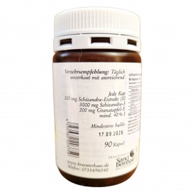 A SANCT BERNHARD Schizandra-Gránátalma kapszula egy étrend-kiegészítő, amely 90 kapszulát tartalmaz. A termék fő összetevői a schizandra és gránátalma kivonatok, amelyek antioxidáns tulajdonságokkal bírhatnak. A B6-, B12-vitamin és folsav hozzájárulhatnak az immunrendszer normál működéséhez. A kapszulák zselatinból készültek, és tartalmaznak kukoricakeményítőt, valamint csomósodást gátló anyagokat is. A termék Németországban készült, és a magyarországi forgalmazója az ODP Vital Kft. A kapszulákat száraz, sötét helyen, 25 °C alatt kell tárolni, és a gyermekektől elzárva tartandók. Az ajánlott napi mennyiséget nem szabad túllépni.