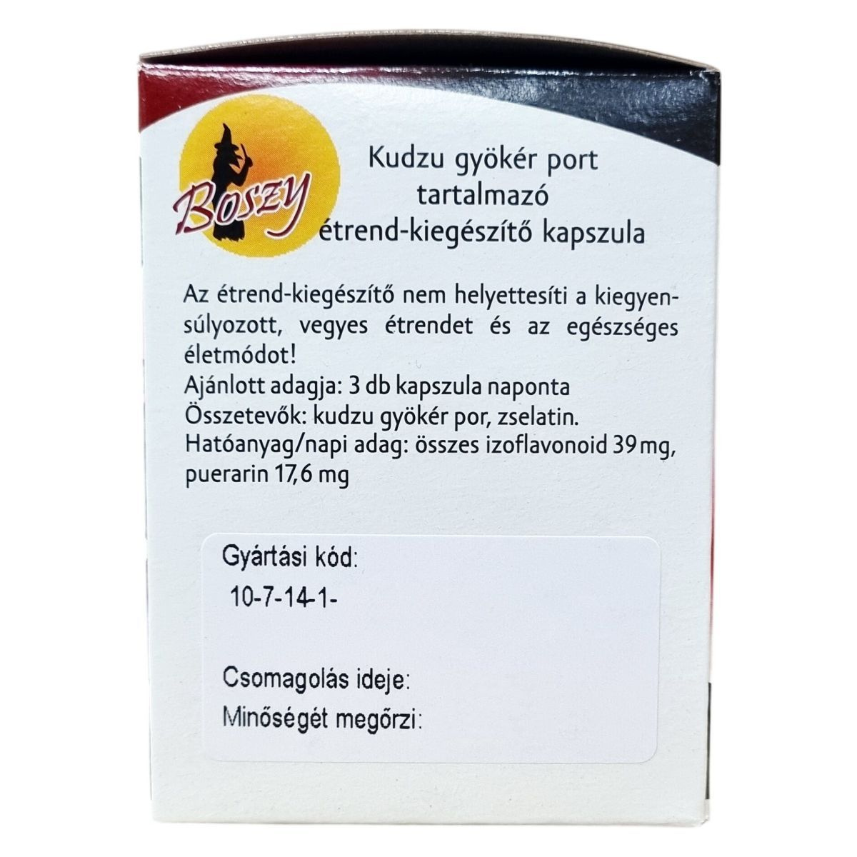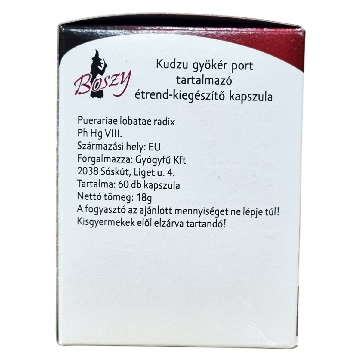 A Boszy Kudzu kapszula kizárólag európai eredetű kudzu gyökér porát tartalmazza (Puerariae lobatae radix, Ph Hg VIII.). Egy csomagban 60 darab kapszula található, nettó tömege 18 gramm. A gyártási kód 10-7-14-1-. A kapszula összetevői között a zselatin is szerepel. A termék fogyasztása mellett ajánlott a kiegyensúlyozott és vegyes táplálkozás és az egészséges életmód fenntartása.