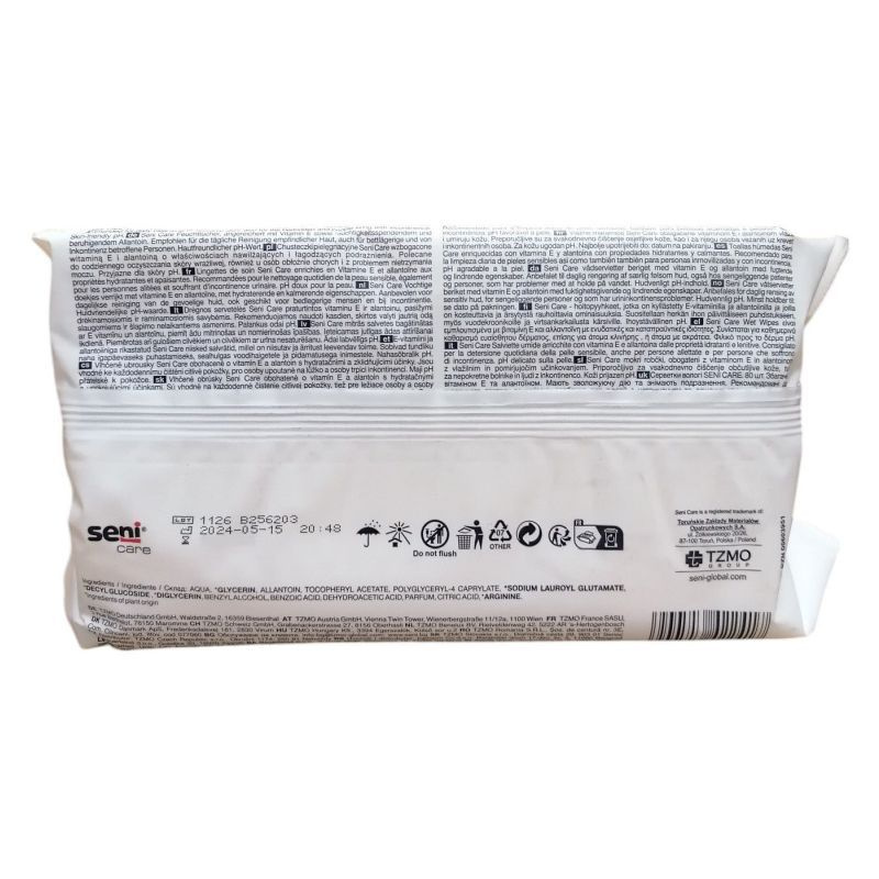 A Seni Care puha, nedves törlőkendő a gyengéd tisztításon felül helyreállítja a bőr rugalmasságát és gyorsítja a regenerációt.