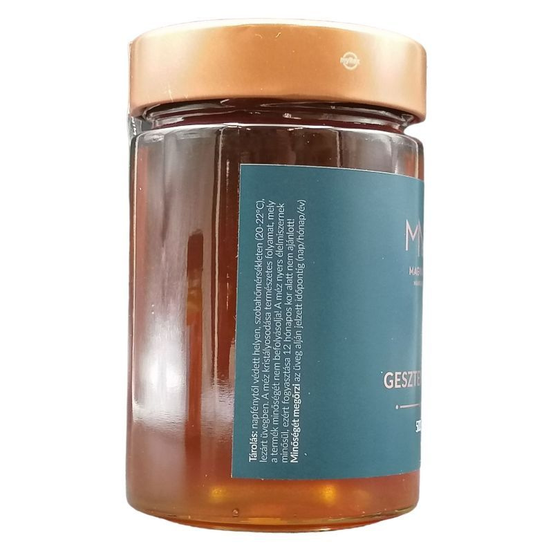 A gesztenyeméz különleges, sötét árnyalatú, és egyedi, fűszeres íze a gesztenyefák virágaiból származik. Gazdag ásványi anyagokban és vitaminokban, mint például kalcium, kálium és B-vitaminok, amelyek segítik a szervezet működését. Kiváló energiaforrás, ami segít a fáradtság legyőzésében.