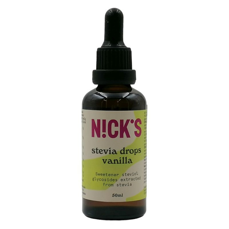 Nick’s vaníliás stevia cseppek 50 ml. Hozzáadott cukrot nem tartalmaz, 0 kalóriás édesítőszer, gluténmentes. Nagy mennyiségben történő fogyasztása hashajtó hatású lehet. Használati utasítás: 5 cseppet adj hozzá a kávédhoz/teádhoz stb.