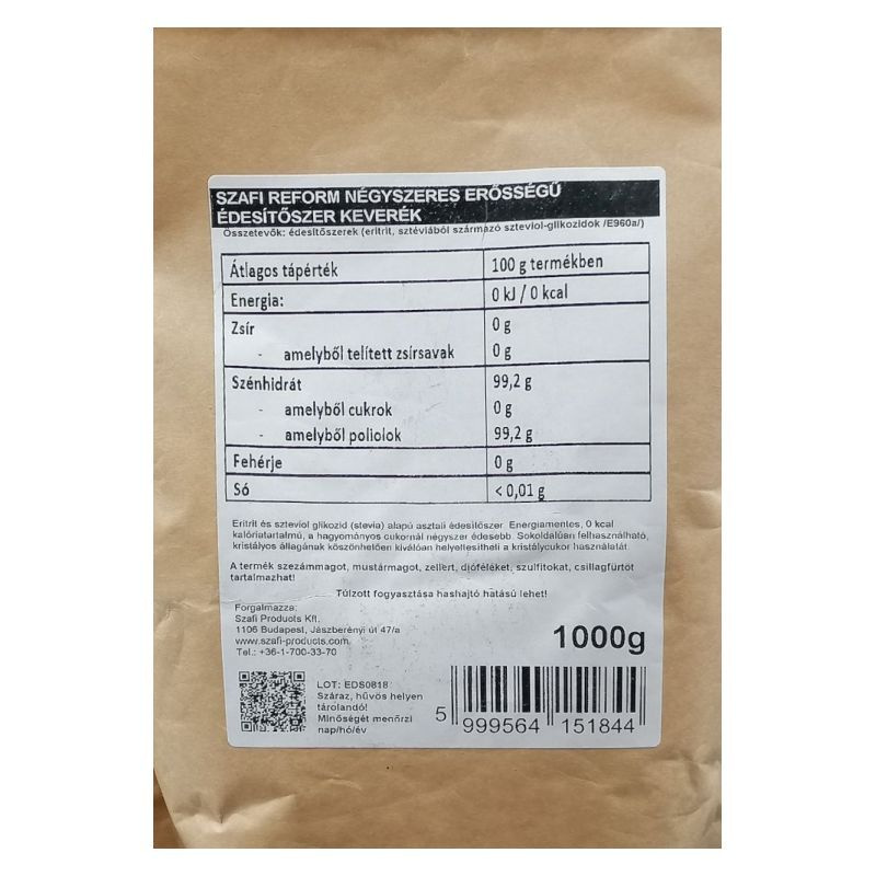 Szafi fitt "0" kalóriás cukorhelyettesítő eritritollal és sztíviával, 0% felszívódó szénhidráttartalommal. Cukorbetegek és fogyókúrázók is fogyaszthatják. Mivel mesterséges édesítőt (szukralózt) nem tartalmaz, így jobban dominál a stevia íze, mint egy szukralózzal betakart édesítő. Viszont a jó hír az, hogy sütés után teljesen elveszíti a stevia kesernyés ízét!