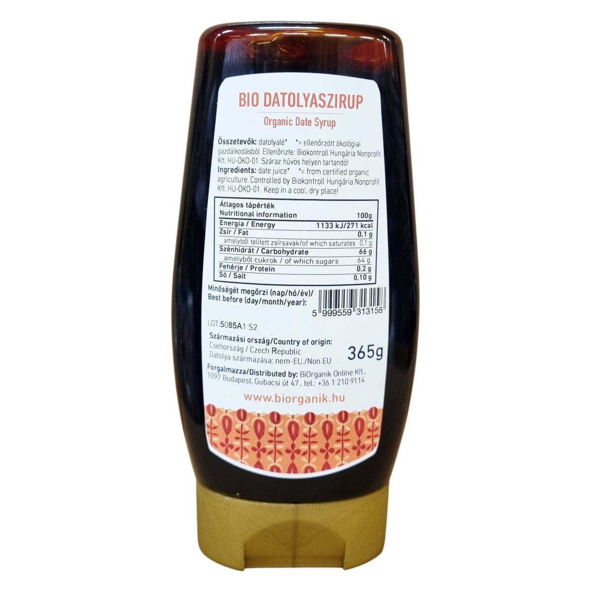 A bio datolyaszirup datolyaléből készül, amely ellenőrzött ökológiai gazdálkodásból származik, és a Biokontroll Hungária Nonprofit Kft. felügyelete alatt áll. A termék Csehországból származik, míg a datolya nem EU-s eredetű. A szirup 365 g-os kiszerelésben kerül forgalomba, és kényelmes használatot biztosít édesítéshez, hozzájárulva a vegán étrendhez.