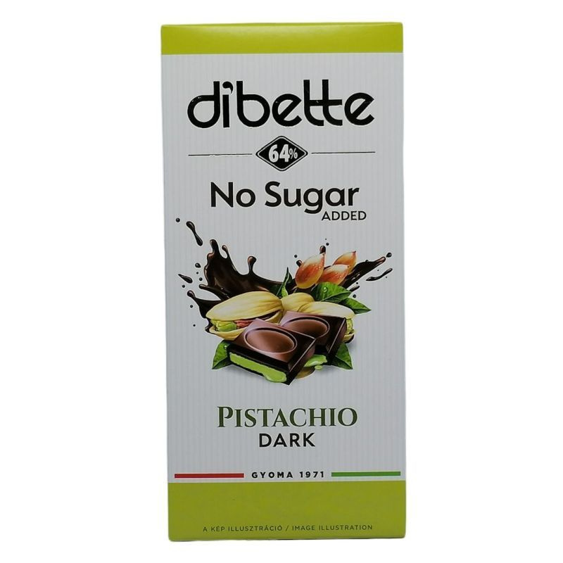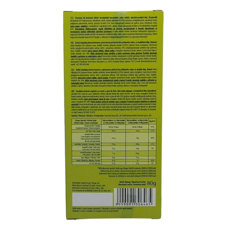 Pisztácia ízű krémmel töltött étcsokoládé tábla hozzáadott cukor nélkül, édesítőszerrel, xilittel és szteviával 80 g.