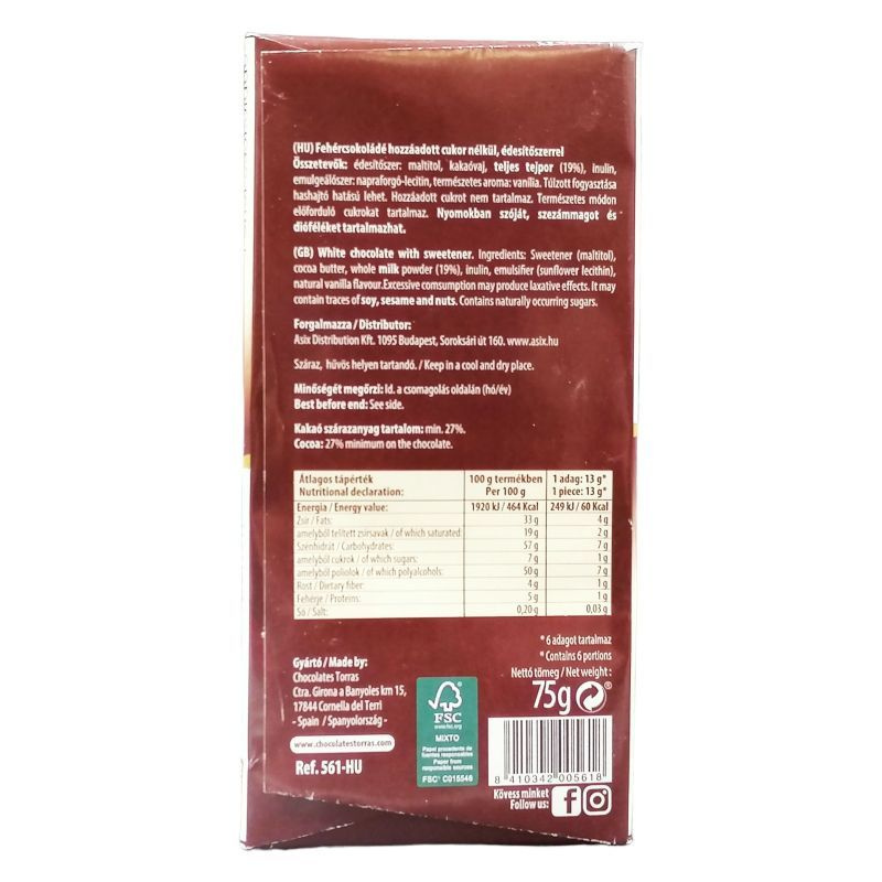 A Torras gluténmentes, cukormentes fehércsokoládé egy ízletes és egészséges alternatíva a klasszikus fehércsokoládé kedvelőinek. Ez a különleges édesség édesítőszerrel készült, így a cukorbevitel csökkentése mellett is élvezhetjük a fehércsokoládé gazdag ízét. A termék kiválóan alkalmas mindazok számára, akik figyelnek az egészségükre, és szeretnék elkerülni a hozzáadott cukrot, ugyanakkor nem akarnak lemondani az édességekről. A fehércsokoládé krémes állaga és lágy íze tökéletesen kiegészíti a különböző desszerteket, süteményeket, vagy akár önálló nassolnivalóként is megállja a helyét. A gluténmentes összetevőknek köszönhetően a termék ideális választás a gluténérzékenyek számára is, így mindenki élvezheti a fehércsokoládé nyújtotta élvezetet anélkül, hogy aggódnia kellene az allergiás reakciók miatt. A Torras fehércsokoládé nemcsak ízletes, hanem tápláló is, hiszen a benne található inulin prebiotikus hatású, amely hozzájárulhat a bélflóra egészségéhez. Ezen kívül a termék alacsony kalóriatartalmú, így remek választás lehet diétázók számára is, akik szeretnék fenntartani a súlyukat, miközben élvezik az édességeket.