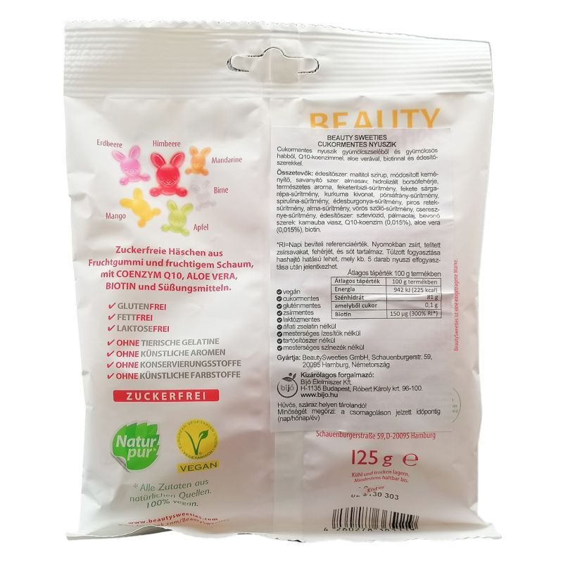 Beauty sweeties vegán gumicukor: vegán termék sosem volt még ennyire finom! glutén-, cukor-, zsír-, laktóz-, tartósítószer- és zselatinmentes. Mesterséges színezéket és ízfokozót nem tartalmaz. Jelen termék cukormentes!