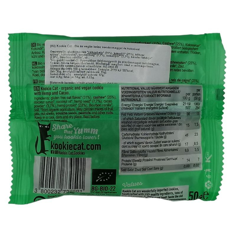 Összetevők: gluténmentes zabpehely* (31%), kesudió* (25%), kókuszvirág nektár*, kókuszolaj*, kendermag*(8%), kakaópor*(3,7%), kenderfehérje (2,8%)*, Bourbon vanília*.* Biogazdálkodásból származó összetevő.