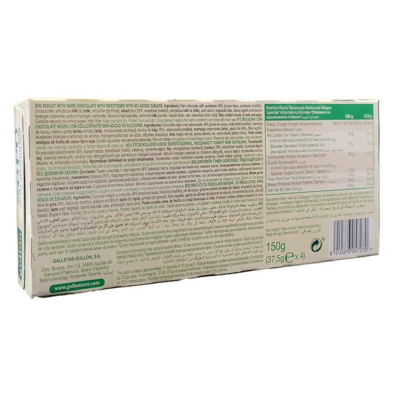 Étcsokoládés keksz édesítőszerrel, hozzáadott cukrot nem tartalmaz.