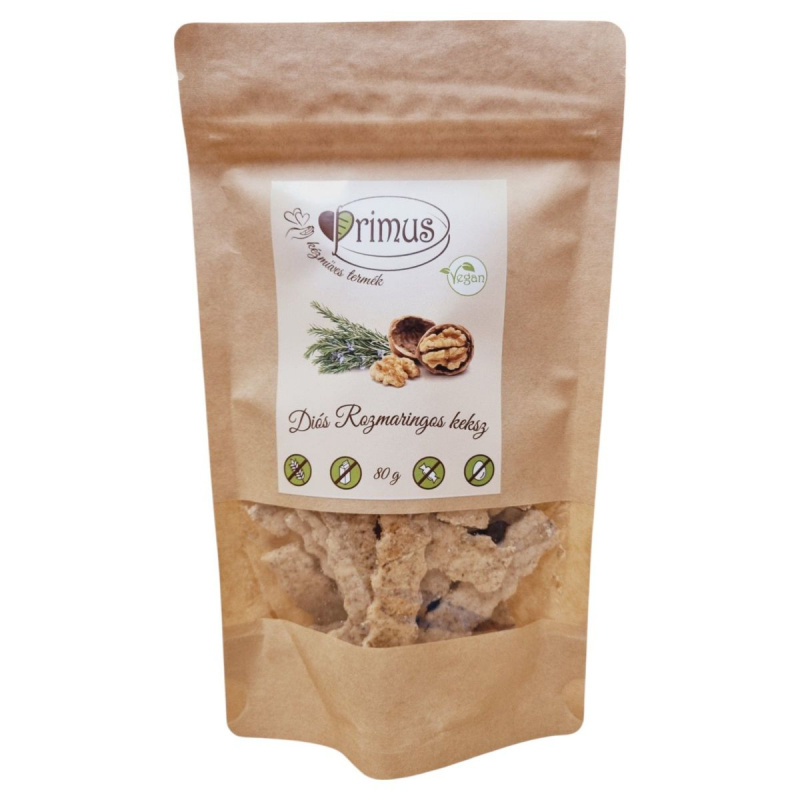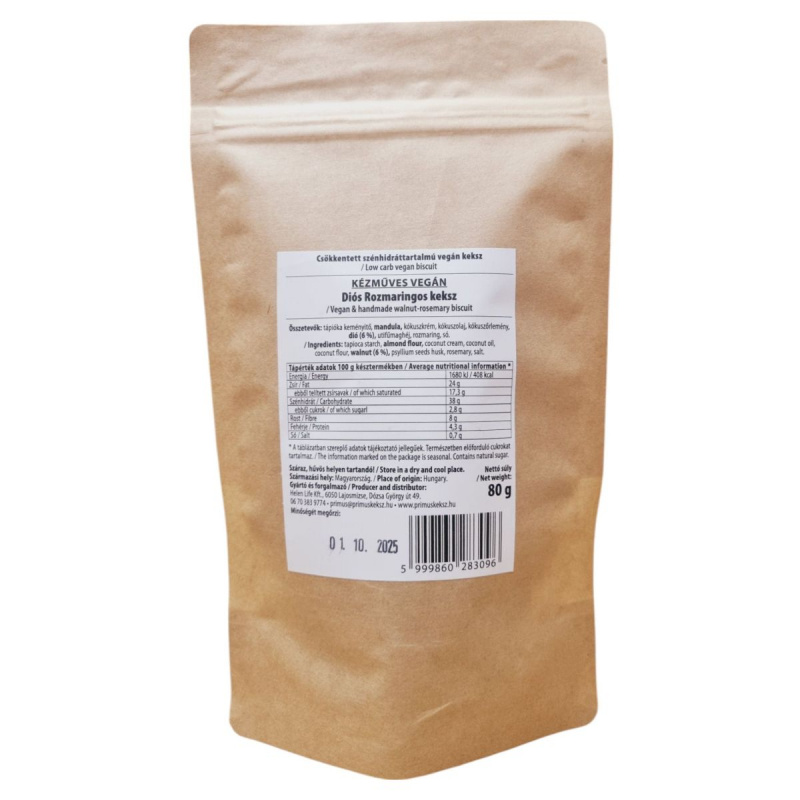 A kézműves vegán keksz diós és rozmaringos ízesítéssel készül, csökkentett szénhidráttartalommal. Ideális választás lehet azok számára, akik vegán étrendet követnek.