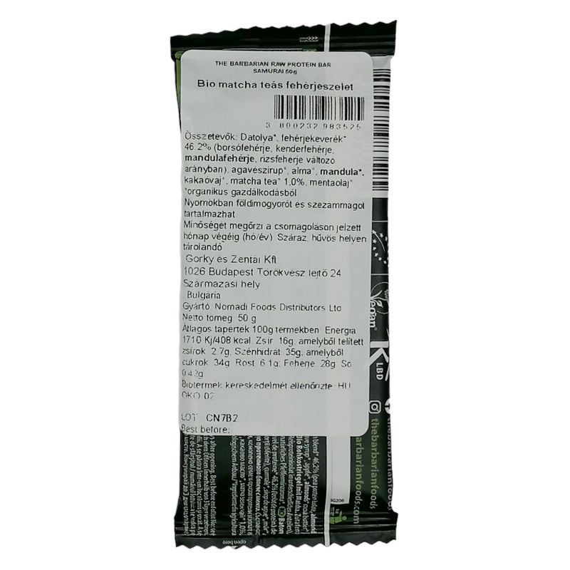 Összetevők: Datolya*, fehérjekeverék* 43,4% (borsófehérje, kenderfehérje, mandulafehérje, rizsfehérje változó arányban), agavészirup*, alma*, mandula*, kakaóvaj*, matcha tea* 1,0%, mentaolaj*. *organikus gazdálkodásból.