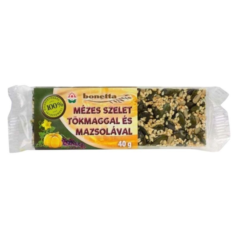 A Bonetta mézes szelet tökmaggal és mazsolával egy ízletes és tápláló ropogtatnivaló, amely tökéletes választás mindazok számára, akik egészséges alternatívát keresnek a napi nassoláshoz. Ez a 40 grammos szelet gazdag olajos magvakban és természetes mézben, így nemcsak finom, hanem tápláló is. Az ökológiai gazdálkodásból származó összetevők garantálják, hogy a termék mentes a mesterséges adalékanyagoktól, így a fogyasztók biztosak lehetnek abban, hogy egy egészséges és természetes finomságot választanak. A méz édes íze és a tökmag ropogós textúrája tökéletes harmóniában van a mazsola lágy édességével, így minden falat egy újabb élvezetet nyújt. A Bonetta mézes szelet ideális választás lehet reggelire, uzsonnára vagy akár sportolás után is, hiszen az olajos magvak és a méz energiát adnak, míg a mazsola természetes cukortartalma segít a gyors regenerálódásban.