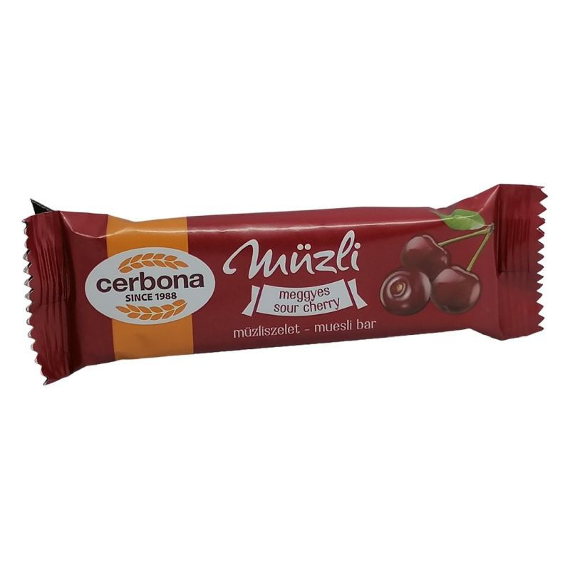 A Cerbona meggyes müzliszeletet többfajta gabonapehely, méz, meggy és csokoládé darabok teszik igazán ellenállhatatlanná.