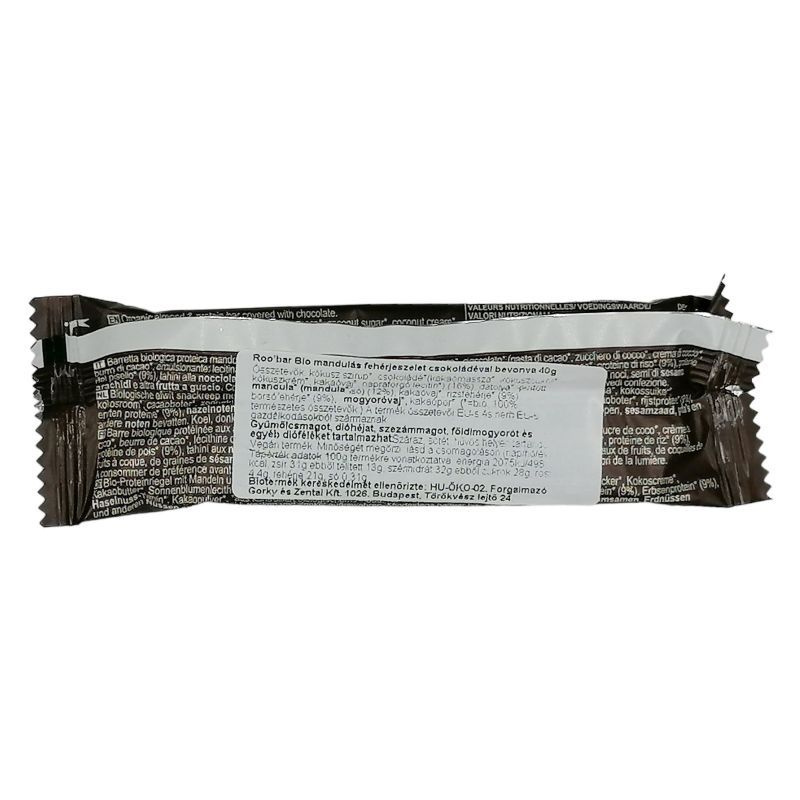 Összetevők: kókuszszirup*, csokoládé* (kakaómassza*, kókuszcukor*, kókuszkrém*, kakaóvaj*, napraforgó lecitin*) (16%), datolya*, pörkölt mandula* (mandula*, só) (12%), kakaóvaj*, rizsfehérje* (9%), borsófehérje* (9%), mogyoróvaj*, kakaópor* biogazdálkodásból.