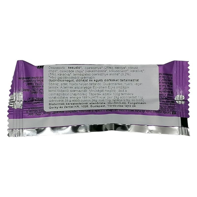 Összetevők: kesudió*, aszalt cseresznye*(25%), datolya*, kókuszreszelék*, csokoládéforgács*(kakaómassza*, kókuszcukor*, kakaóvaj*)(5%), kakaóvaj* biogazdálkodásból származó nyersanyagok.