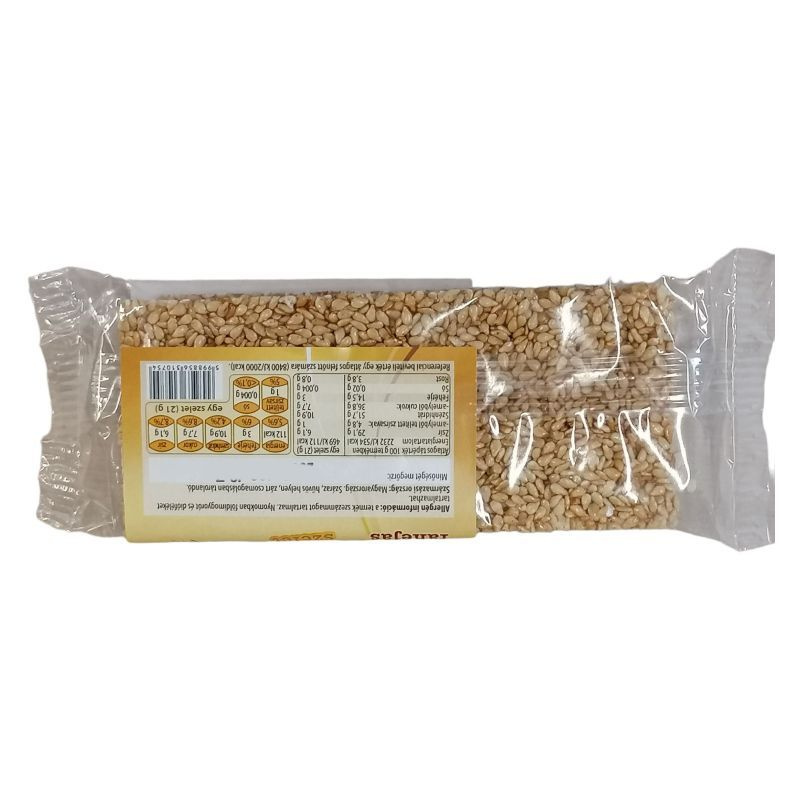 Összetevők: hántolt fehér szezámmag 49%, cukor, glükózszirup, fahéj 1%.