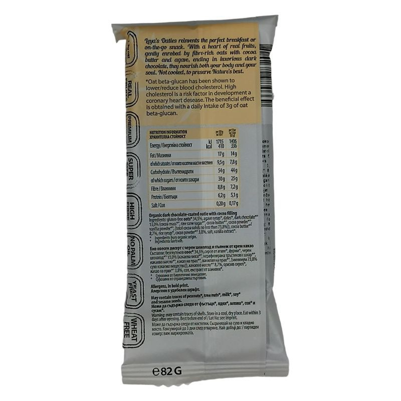 Összetevők: Gluténmentes zab* 34,5%, agavészirup*, datolya*, étcsokoládé* 13% (kakaómassza 64%, nyers nádcukor 28,6%, kakaóvaj 7%, emulgeálószer: szójalecitin 0,4%, vaníliakivonat 0,03%), kakaóvaj* 8,7%, rizsszirup*, kakaópor* 3,8% Himalája só, vaníliaaroma*, juhararoma*. *organikus gazdálkodásból.