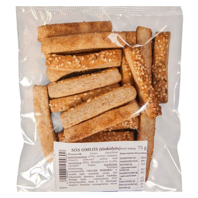 A sós sütemény teljes kiőrlésű tönkölybúzaliszttel készül, omlós állagú, sós nassolnivaló.