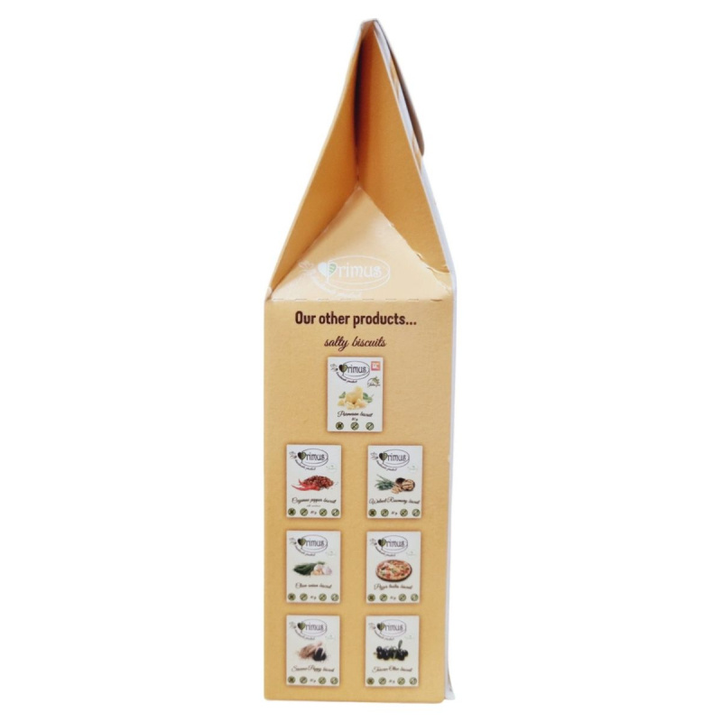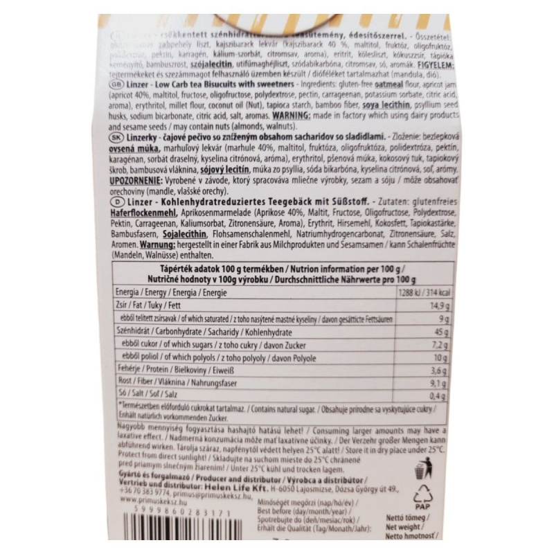 A Primus Linzer egy kézzel készített, csökkentett szénhidráttartalmú teasütemény, amely édesítőszerrel készül. Gluténmentes zabpehely liszt és kajszibarack lekvár felhasználásával készült, így azok számára is ideális lehet, akik gluténmentes étrendet követnek. A termék természetben előforduló cukrokat tartalmaz, és nagyobb mennyiség fogyasztása hashajtó hatású lehet. Tárolása száraz, napfénytől védett helyen ajánlott, 25°C alatt. A termék tejtermékeket és szezámmagot felhasználó üzemben készült, és dióféléket is tartalmazhat.