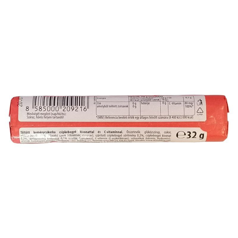 Töltött keménycukorka csipkebogyó kivonattal és C-vitaminnal.