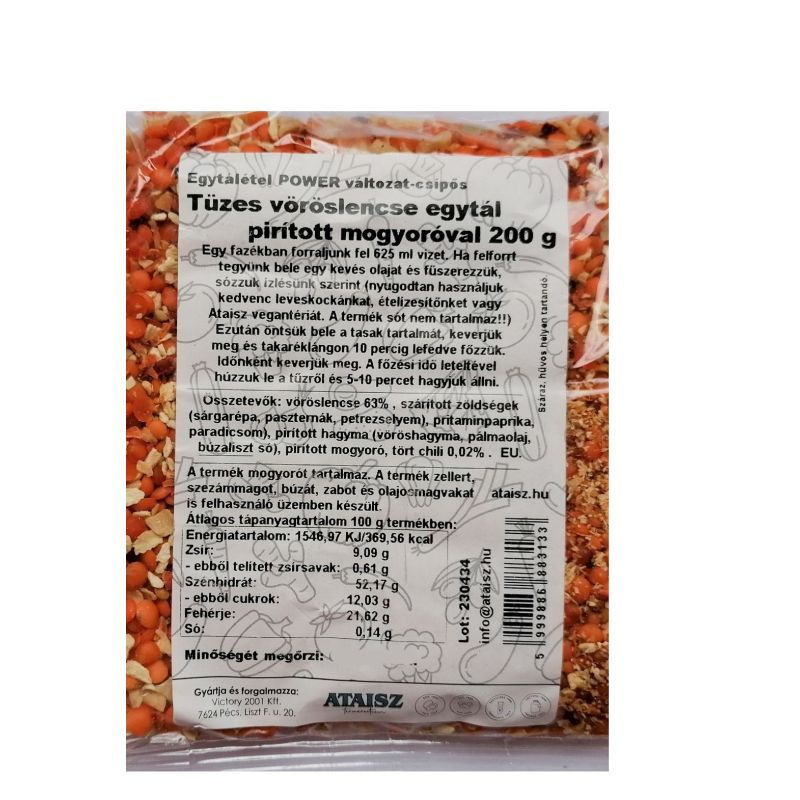 Összetevők: vöröslencse (Török) szárított zöldségek (EU) szárított pritamin paprika (Kína) szárított paradicsom (Kína) pirított, szárított hagyma (Kína) pirított mogyoró (Török) tört chili (Kína)