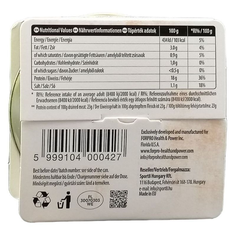 Tápérték adatok 100 g termékben: Energia: 434 kJ/ 103 Kcal, zsír: 3,0 g -ebből telített zsírsav: 0,9 g, szénhidrát: 1,0 g -ebből cukor: <0,5 g, fehérje: 18 g, só: 1,1 g.
