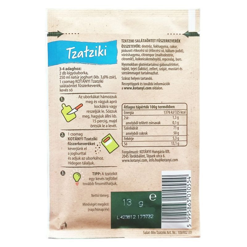 A Kotányi tzatziki salátaöntet por egy ízletes és praktikus megoldás, amely lehetővé teszi, hogy gyorsan és egyszerűen készítsünk el egy klasszikus görög tzatziki öntetet. Ez a fűszerkeverék tökéletes választás azok számára, akik szeretik a friss, joghurt alapú önteteket, és szeretnék feldobni salátáikat, grillételeiket vagy akár szendvicseiket. A por formátumának köszönhetően könnyen tárolható és adagolható, így mindig kéznél van, amikor szükség van rá. A tzatziki ízvilága a friss uborka, a fokhagyma és a joghurt harmonikus kombinációjából áll, amely nemcsak ízletes, hanem egészséges választás is. Az öntet elkészítése rendkívül egyszerű: csupán annyira van szükség, hogy a port joghurtba vagy kefírbe keverjük, esetleg olívaolajjal gazdagítva, így egy krémes és ízletes öntetet kapunk, amely tökéletesen illik a nyári salátákhoz vagy grillezett húsokhoz.