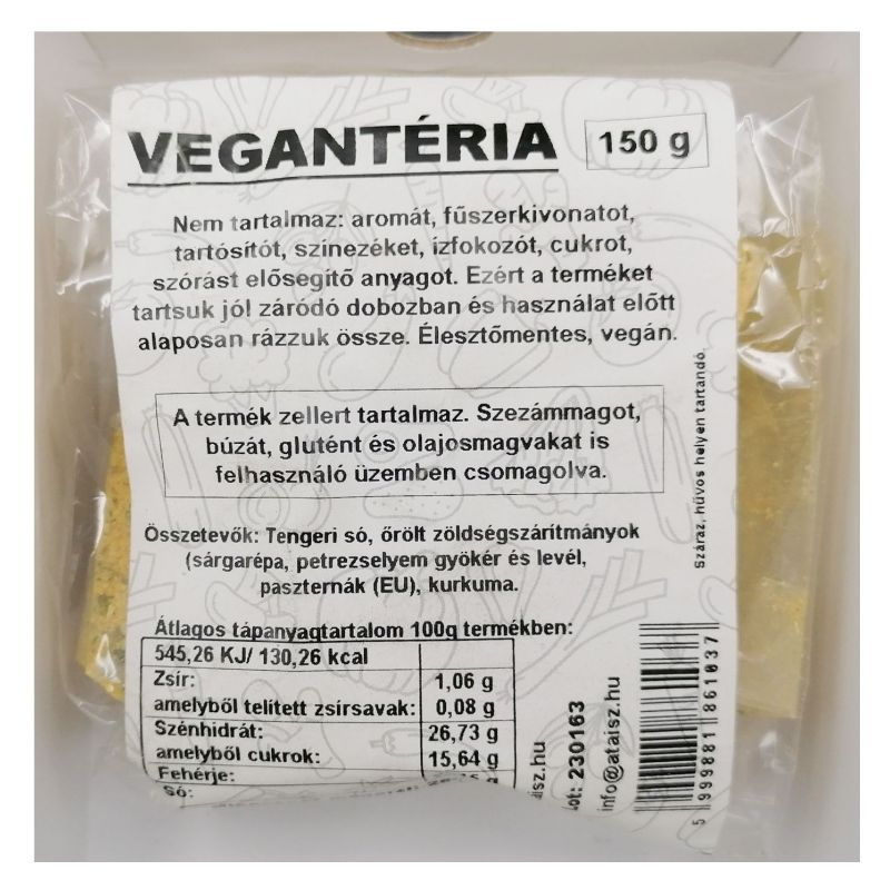 Vegantéria ételízesítő 150g, amely ízletes és vegánbarát fűszerezést biztosít különféle ételekhez.