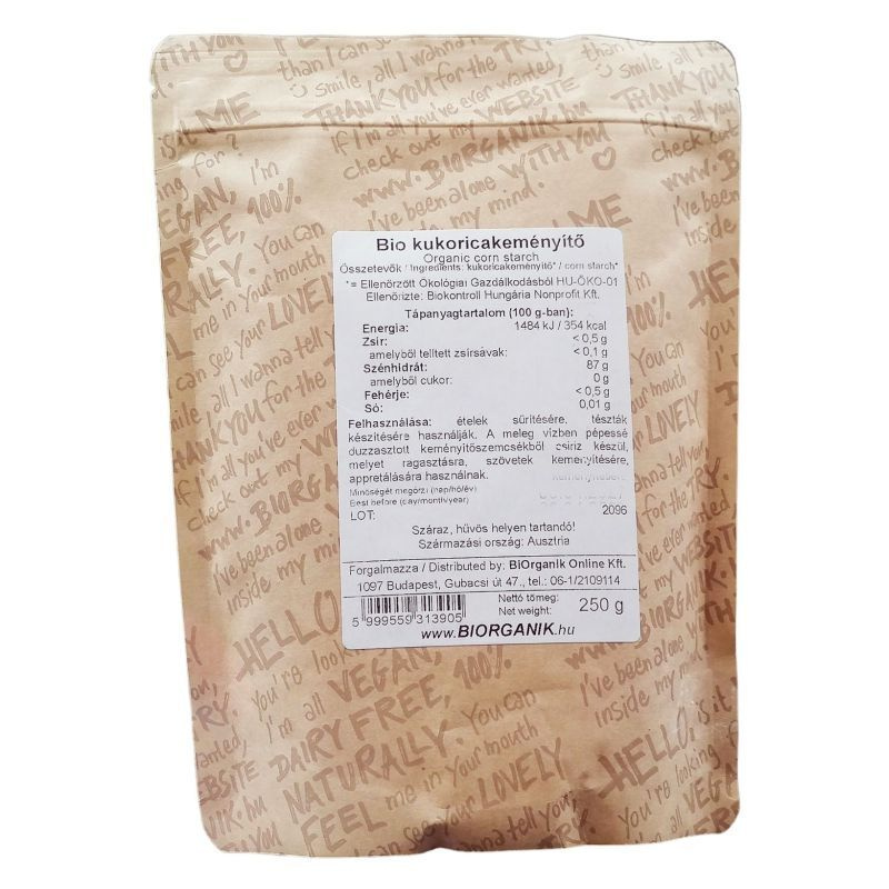 Bio kukoricakeményítő, ellenőrzött ökológiai gazdálkodásból. Zselatinmentes keményítő. Felhasználási javaslat: ételek, pudingok, desszertek, levesek, szószok sűrítésére, tészták készítésére, valamint textíliák keményítéséhez. Átlátszóan sűrít. Allergének: gabonát, szójababot, dióféléket, zellert, mustárt, szezámmagot csomagoló üzemben készült.
