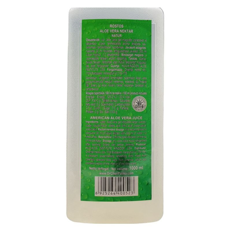 Húsos aloe vera levelekből készült ital, a belekevert felaprított Aloe vera darabok adják a készítmény értékes rosttartalmát.