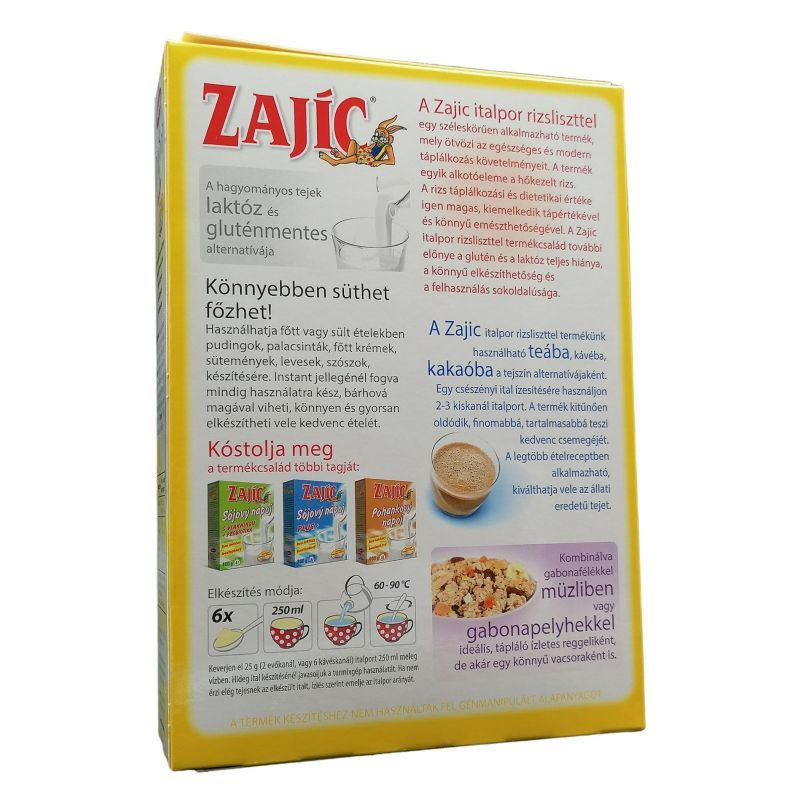 Zajic gluténmentes rizs italpor ajánljuk: reggeli italok, müzlik, tudmixok alkotórészeként, de felhasználható a legkülönfélébb főtt ételek elkészítéséhez is a tehéntej kiváltására (Pl.: édességekbe, pudingokhoz vagy főzelékbe.)