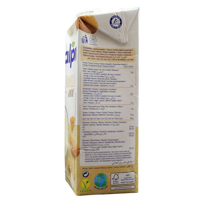 Összetevők: ivóvíz, cukor, mandula (2,3%), cikóriagyökérrost, trikálcium-foszfát, természetes vanília aroma, tengeri só, stabilizátorok (szentjánoskenyérliszt, gellángumi), emulgeálószer (lecitinek (napraforgó)), vitaminok (B2, B12, E, D2).