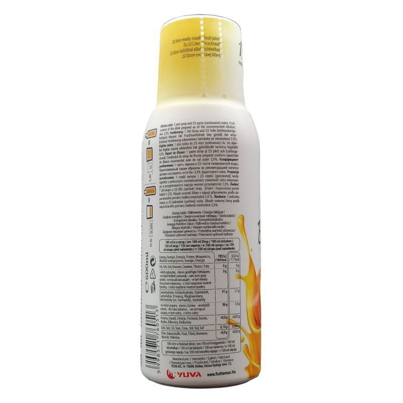 Fruttamax gyümölcsszörp narancs 50% gyümölcstartalommal,1: 23 hígitási arány, steviaval és izocukorral édesítve.