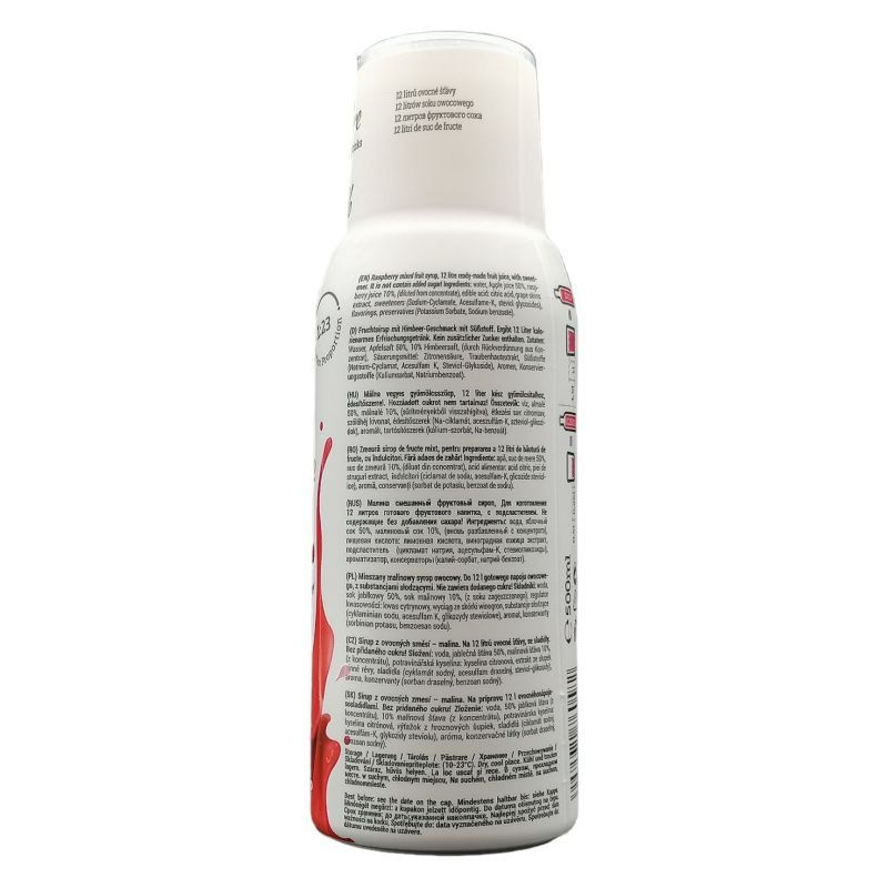Összetevők: víz, málnalé 26%, almalé 24% (sűrítményekből visszahígítva), étkezés sav: citromsav, szőlőhéj kivonat, édesítőszerek (Na-ciklamát, aceszulfám-K, szteviol-glikozidok), aroma, tartósítószerek: kálium-szorbát, Na-benzoát.