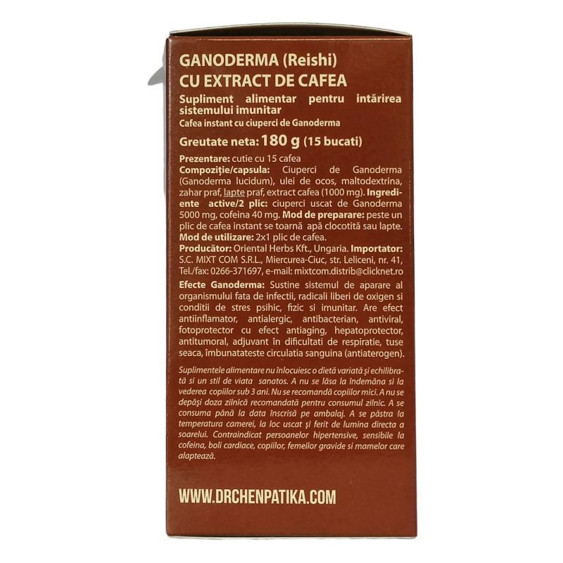 Az immunrendszer támogatásához azonnal oldódó kávé ganoderma gombával. A kávézás élménye és frissítő hatása mellett erősíthetjük szervezetünk védekező mechanizmusát, az immunrendszert. A ganoderma gomba a távol-keleti legendák egészség-elixírje. A pecsétviaszgomba (Reishi, Ganoderma lucidum) támogatja a szervezet természetes védekező képességét és segíti a keringés egészségét. Adagolás (felhasználás): naponta kétszer 1 tasak kávépor meleg vízben vagy tejben oldva. Összetevők: ganoderma lucidum (pecsétviaszgomba), kókusz olaj, maltodextrin, porított cukor, tejpor, kávé kivonat. Hatóanyagok a napi adagra: napi 2 tasakra: szárított pecsétviaszgomba: 5000 mg, koffein: 40 mg.