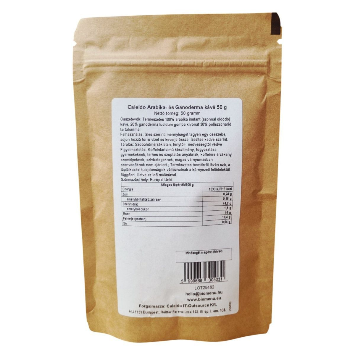 A Caleido Arabika- és Ganoderma kávé egy különleges ital, amely 100% arabika instant kávéból és ganoderma lucidum gomba kivonatból készül. A termék vegán, és a ganoderma gomba jótékony hatásait kínálja. A kávé koffeintartalmú, ezért nem ajánlott gyermekeknek, terhes és szoptatós anyáknak, valamint koffeinre érzékeny személyeknek. A termék táplálkozási tulajdonságai változhatnak a környezeti feltételektől függően. Tárolása szobahőmérsékleten, fénytől és nedvességtől védve javasolt. A terméket a Caleido IT-Outsource Kft. forgalmazza.