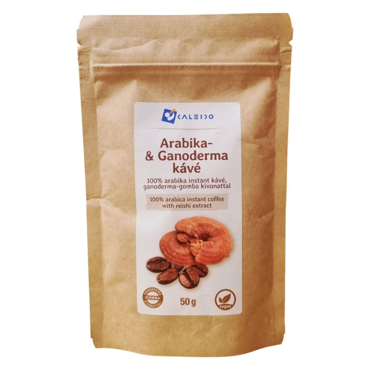 A Caleido Arabika- és Ganoderma kávé 100% arabika instant kávéból és ganoderma-gomba kivonatból készül. Ez a vegán termék különleges ízélményt nyújt, miközben a ganoderma gomba jótékony hatásait is élvezheti.